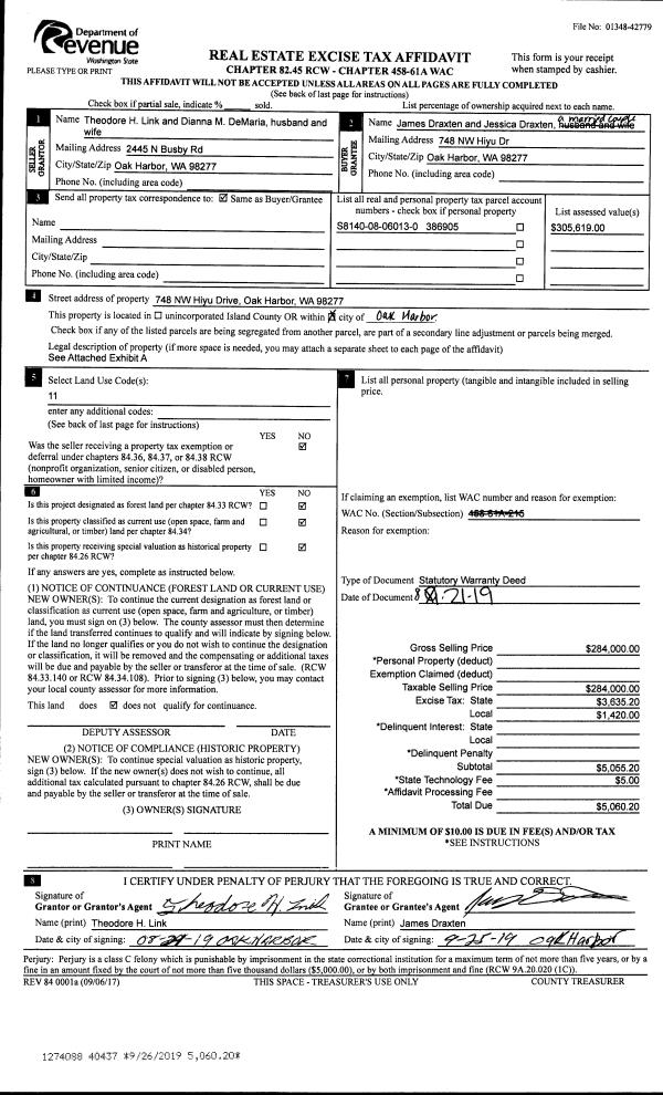 | Mailing Address: | JESSICA DRAXTEN 748 NW HIYU DR OAK HARBOR, WA 98277 | % Ownership: | 100.0000000000% |