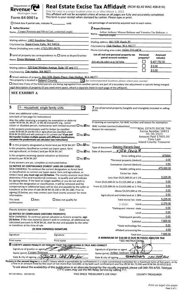 | 1 | 05/26/2023 | WD | Warranty Deed | PETERSON, COOPER | BALTAZAR, ARTHUR ANTHONY MINOZA | | | $475,000.00 | 56833 | 4560423 |