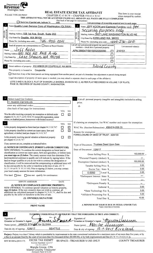 | 1 | 12/06/2017 | TRUSTEED | Trustee's Deed | RACHELS, MICHAEL | KOON, JEFF | | | $153,000.00 | 32217 | 4435518 |