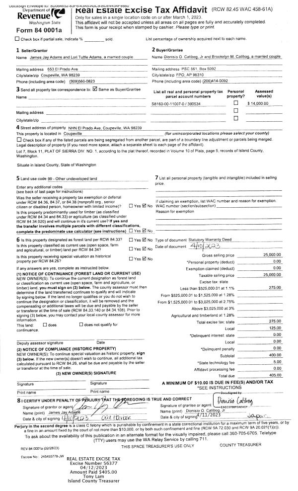 | 1 | 04/10/2023 | WD | Warranty Deed | ADAMS, JAMES JAY | CATIBOG, DIONISIO O | | | $25,000.00 | 56377 | 4558690 |