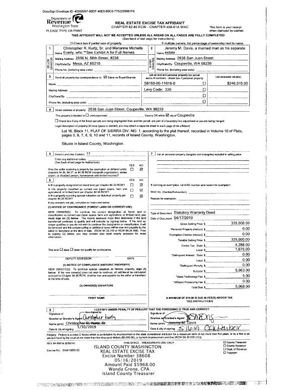 | 2 | 04/17/2019 | WD | Warranty Deed | KURTZ SR, CHRISTOPHER R | DAVIS, JEREMY M | | | $335,000.00 | 38608 | 4463802 |
