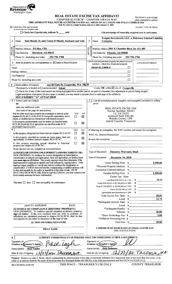 | 2 | 12/14/2020 | WD | Warranty Deed | MOODY II, KEN | FRAGALE INVESTMENTS, LLC | | | $2,550.00 | 46301 | 4506284 |