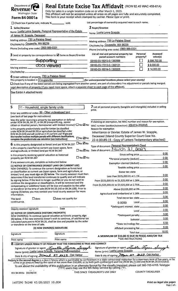 | 1 | 03/21/2023 | PRD | Personal Representatives Deed | SCAPPLE, JAMES W | SCAPPLE, LUELLA LYNNE | | | $0.00 | 56248 | 4558212 |