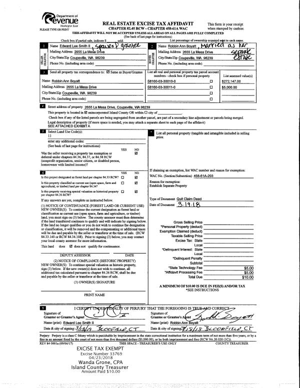 | 1 | 03/19/2018 | QCD | Quit Claim Deed | BOYATT, ROBBIN ANN | BOYATT, ROBBIN ANN | | | $0.00 | 33769 | 4442992 |