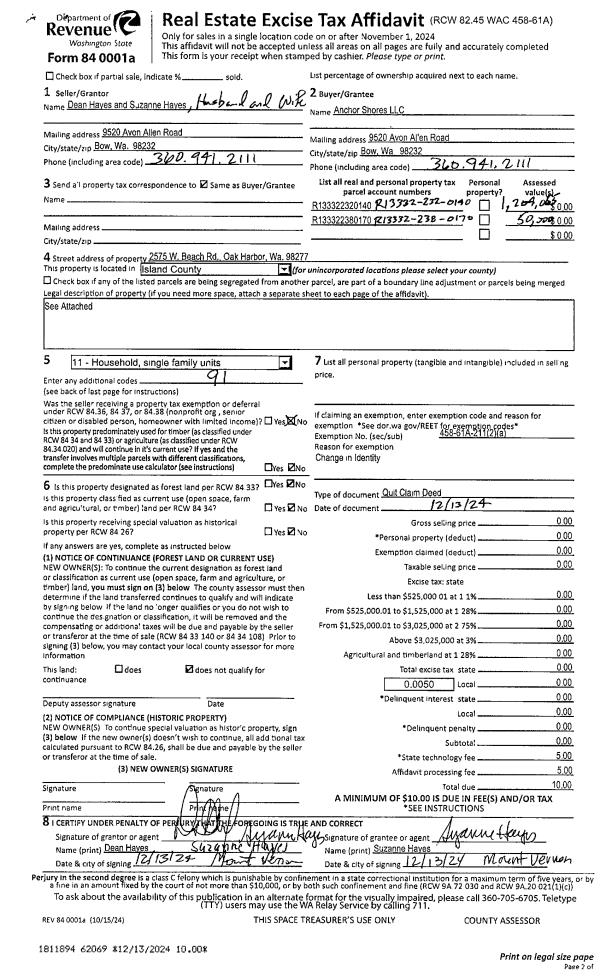 | 2 | 12/13/2024 | QCD | Quit Claim Deed | HAYES, DEAN | ANCHOR SHORES LLC | | | $0.00 | 62069 | 4580375 |