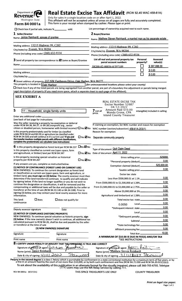 | 1 | 04/11/2022 | QCD | Quit Claim Deed | REINHARDT, JANICE | REINHARDT, MATTHEW STEVEN | | | $0.00 | 52687 | 4543203 |