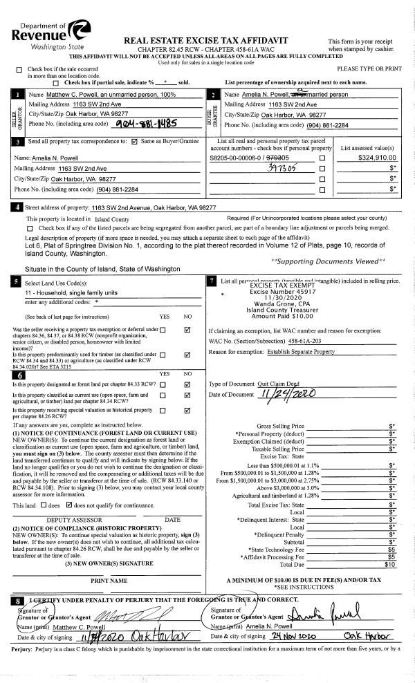 | 3 | 11/24/2020 | QCD | Quit Claim Deed | POWELL, AMELIA | POWELL, AMELIA | | | $0.00 | 45918 | 4503712 |