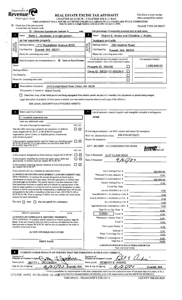 | 1 | 09/25/2020 | WD | Warranty Deed | JACOBSEN, BETTY L | ANDRE, ROBERT E | | | $760,003.00 | 44995 | 4498119 |