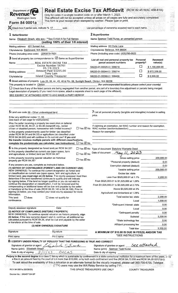| 2 | 07/31/2017 | QCD | Quit Claim Deed | NURSE, BRUCE L | DUNGENESS CLAW, LLC | | | $0.00 | 30563 | 4427857 |