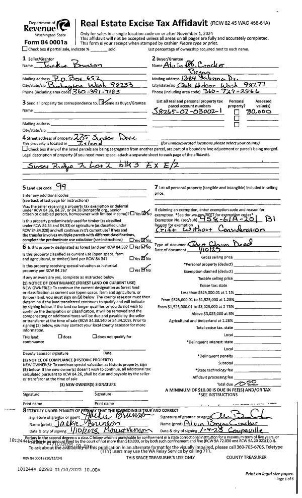 | 1 | 01/10/2025 | QCD | Quit Claim Deed | BRUNSON, JACKIE | CROCKER, ALVIN | | | $0.00 | 62280 | 4581130 |