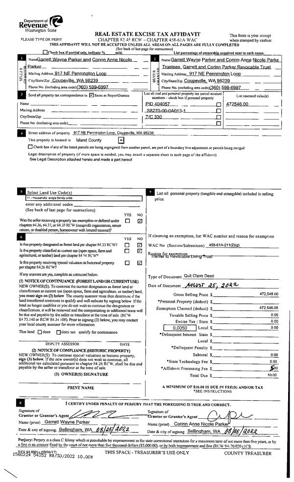 | Mailing Address: | CORINN ANNE NICOLE PARKER TTEE 917 NE PENNINGTON LOOP COUPEVILLE, WA 98239 | % Ownership: | 100.0000000000% |