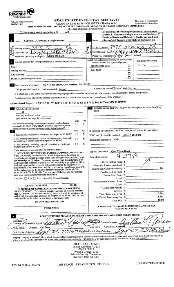 | 1 | 09/27/2019 | QCD | Quit Claim Deed | GARRISON, CYNTHIA L | GARRISON JTWROS, CYNTHIA L | | | $0.00 | 40477 | 4472313 |