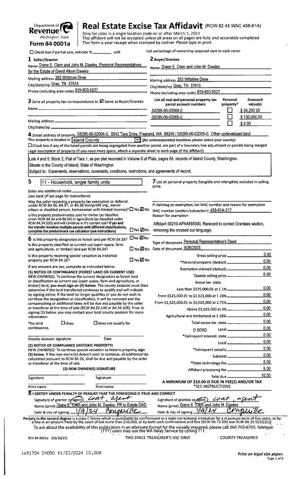 | 2 | 10/04/2023 | PRD | Personal Representatives Deed | DAWLEY, DAVID ALBERT | CLEM, DIANE E | | | $0.00 | 58210 | 4565590 |