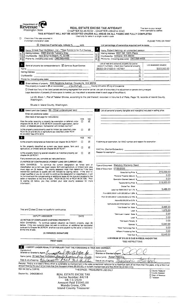 | 1 | 07/30/2020 | WD | Warranty Deed | MCGIBBON, ERNEST P | NEHRING, ROBERT | | | $315,000.00 | 44218 | 4493755 |