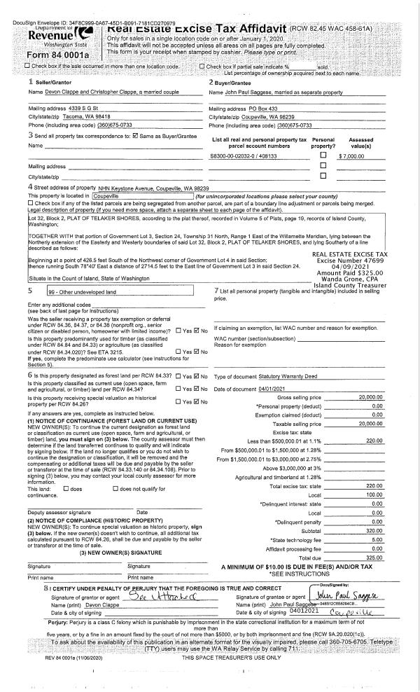 | 1 | 04/01/2021 | WD | Warranty Deed | CLAPPE, DEVON | SAGGESE, JOHN PAUL | | | $20,000.00 | 47699 | 4516052 |