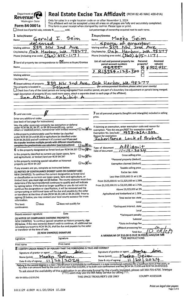 | 1 | 11/15/2024 | LACPROBATE | Lack of Probate | SEIM, GERALD I | SEIM, MOEKO | | | $0.00 | 61889 | 4579661 |