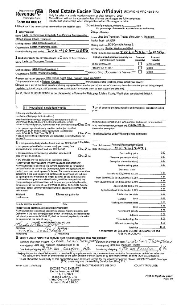 | 1 | 03/26/2021 | PRD | Personal Representatives Deed | THOMPSON, JOHN H | THOMPSON TTEE, LINDA LOU | | | $0.00 | 47562 | 4515056 |