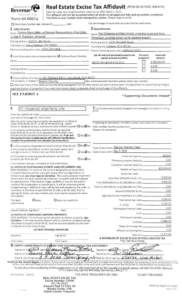 | 2 | 05/05/2022 | WD | Warranty Deed | ROBERTSON, DALE R | DICKERSON, PAUL | | | $820,000.00 | 53096 | 4545102 |