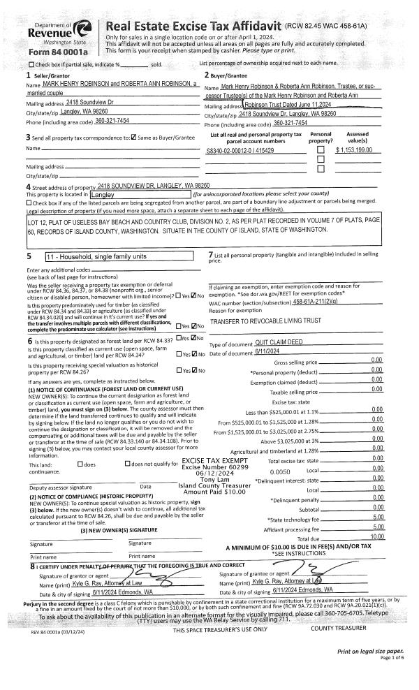 | 1 | 06/11/2024 | QCD | Quit Claim Deed | ROBINSON, MARK H | ROBINSON TTEE, MARK HENRY | | | $0.00 | 60299 | 4573369 |