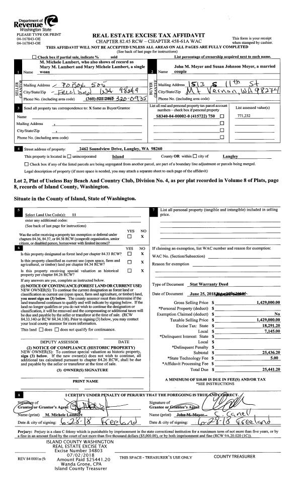 | 1 | 06/25/2018 | WD | Warranty Deed | LAMBERT, MARY M | MEYER, JOHN M | | | $1,429,000.00 | 34803 | 4447242 |