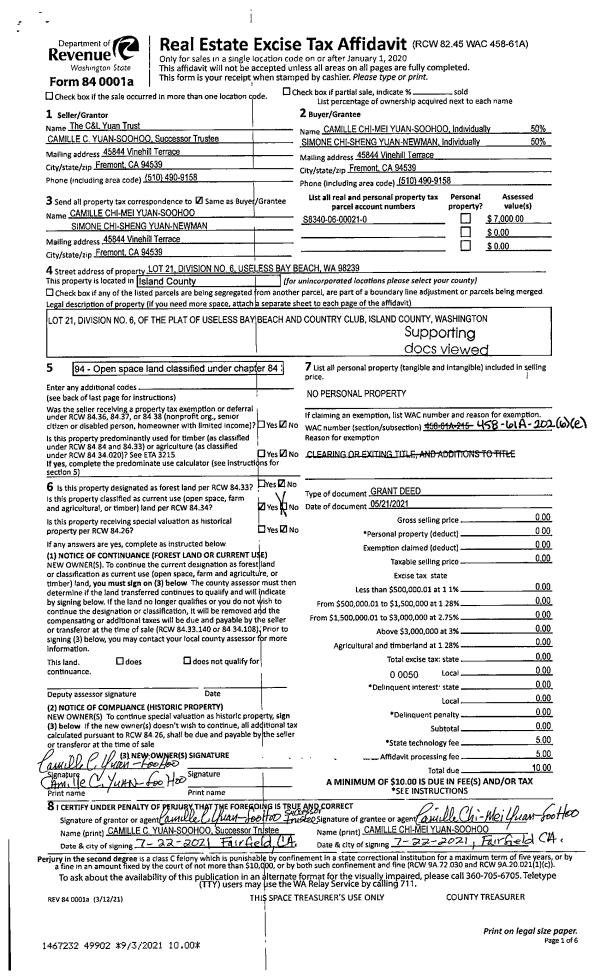 | 1 | 05/21/2021 | GRANTD | Grant Deed | YUAN TRUSTEE, CHIA YAO | YUAN-SOO HOO, CAMILLE C | | | $0.00 | 49902 | 4528370 |