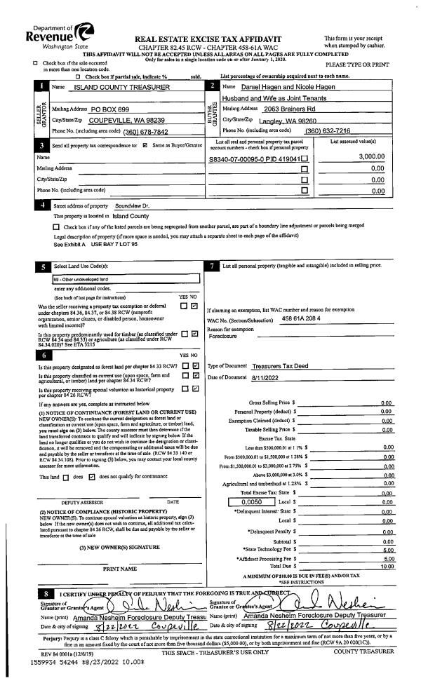 | 1 | 08/11/2022 | TTAXD | Treasurer's Tax Deed | ISLAND COUNTY TAX TITLE | HAGEN, DANIEL | | | $0.00 | 54244 | 4550069 |