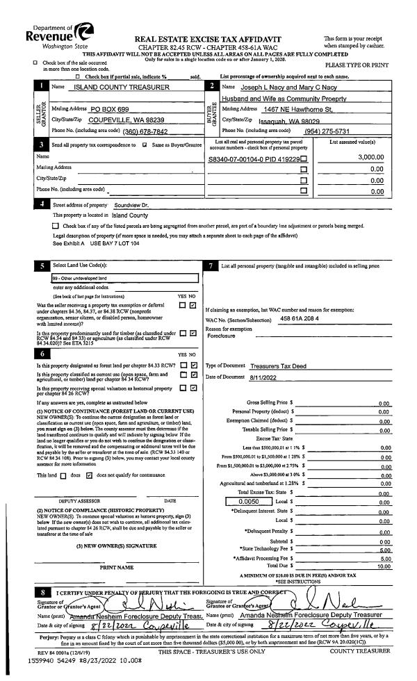 | 2 | 08/11/2022 | TTAXD | Treasurer's Tax Deed | ISLAND COUNTY TAX TITLE | NACY, JOSEPH L | | | $0.00 | 54249 | 4550136 |