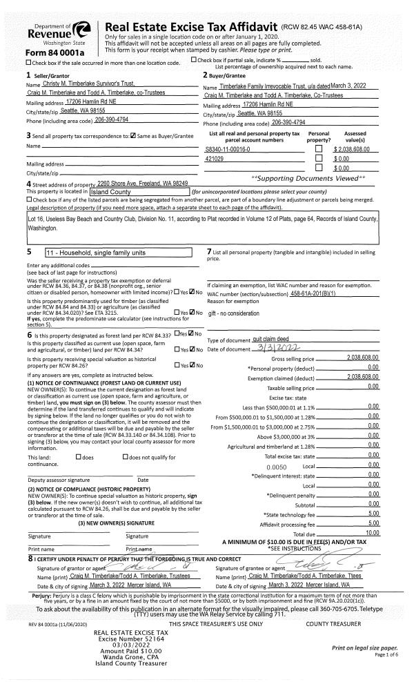 | 2 | 03/03/2022 | QCD | Quit Claim Deed | TIMBERLAKE TTEE, CRAIG M | TIMBERLAKE TTEE, CRAIG M | | | $0.00 | 52164 | 4540813 |