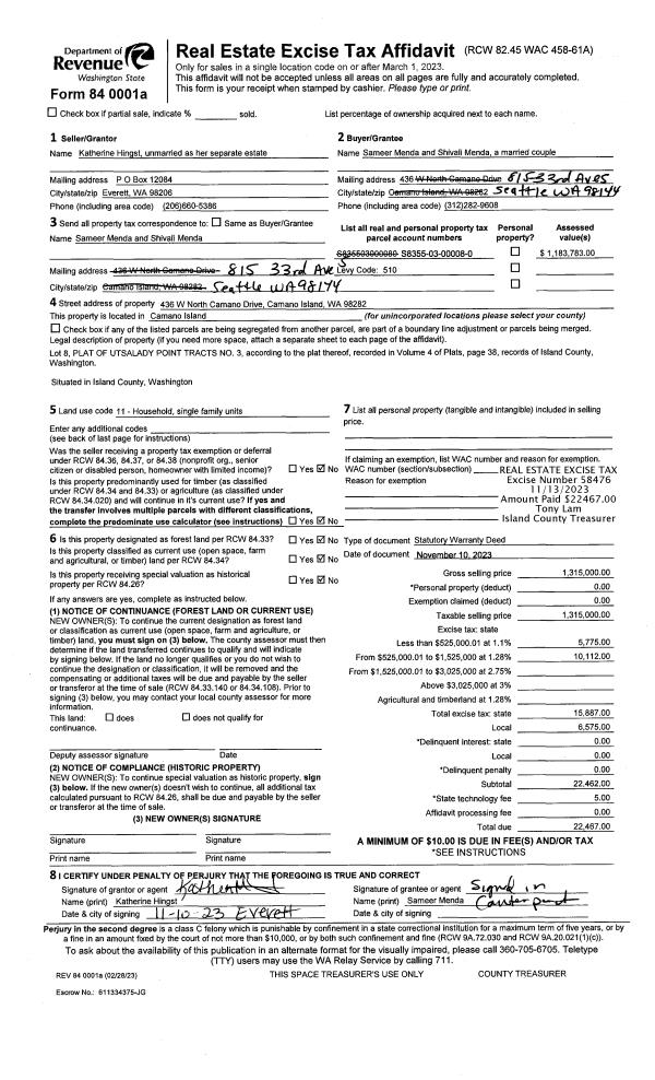 | 1 | 11/10/2023 | WD | Warranty Deed | HINGST, KATHERINE | MENDA, SAMEER | | | $1,315,000.00 | 58476 | 4566613 |