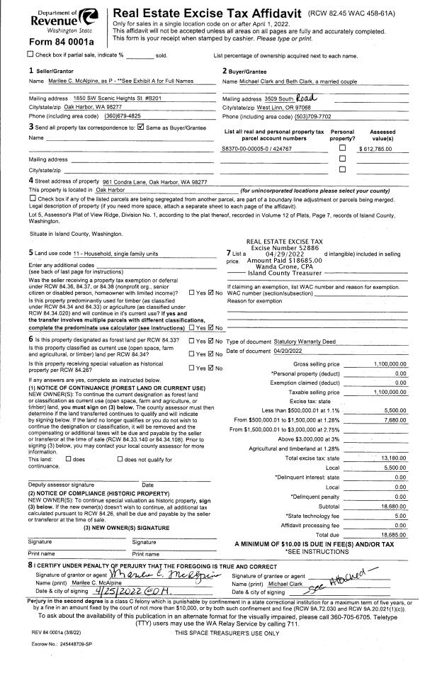 | 1 | 04/20/2022 | WD | Warranty Deed | MCALPINE, JAMES L | CLARK, MICHAEL | | | $1,100,000.00 | 52886 | 4544220 |