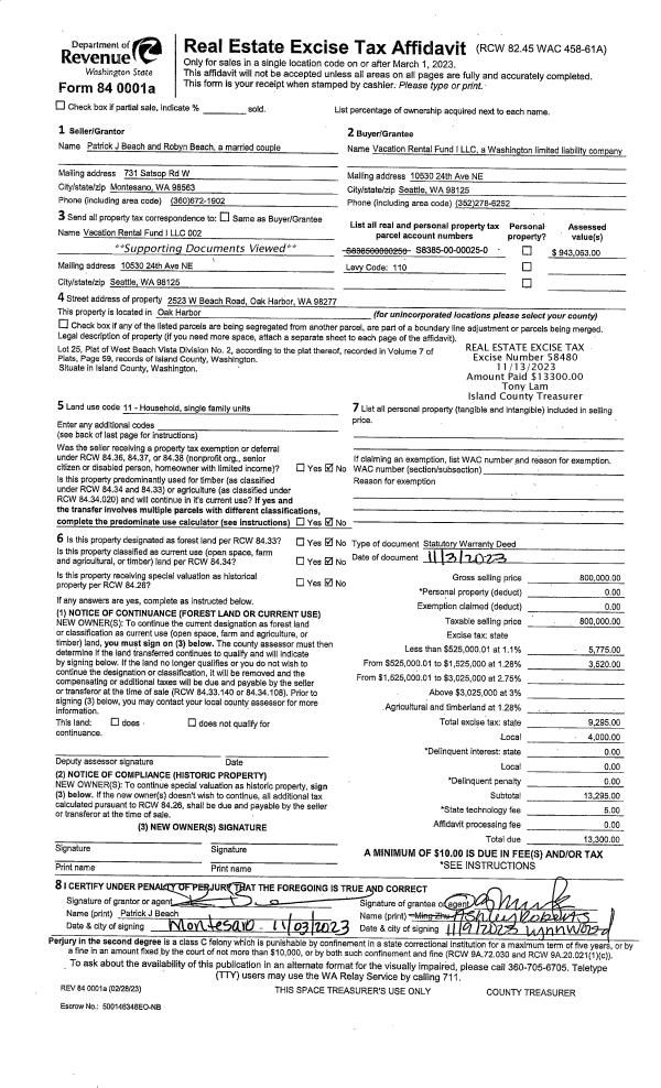 | 2 | 11/03/2023 | WD | Warranty Deed | BEACH, PATRICK J | VACATION RENTAL FUND I LLC | | | $800,000.00 | 58480 | 4566621 |