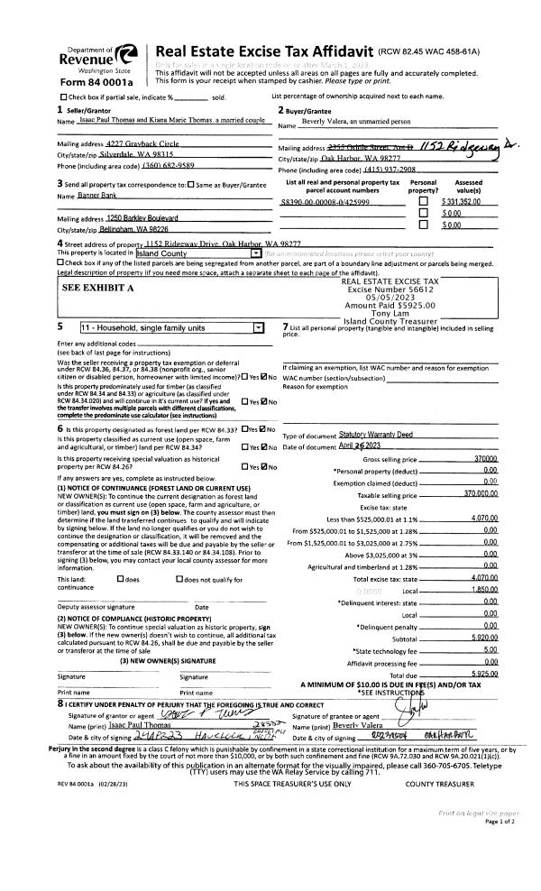 | 1 | 04/26/2023 | WD | Warranty Deed | THOMAS, ISAAC PAUL | VALERA, BEVERLY | | | $370,000.00 | 56612 | 4559588 |