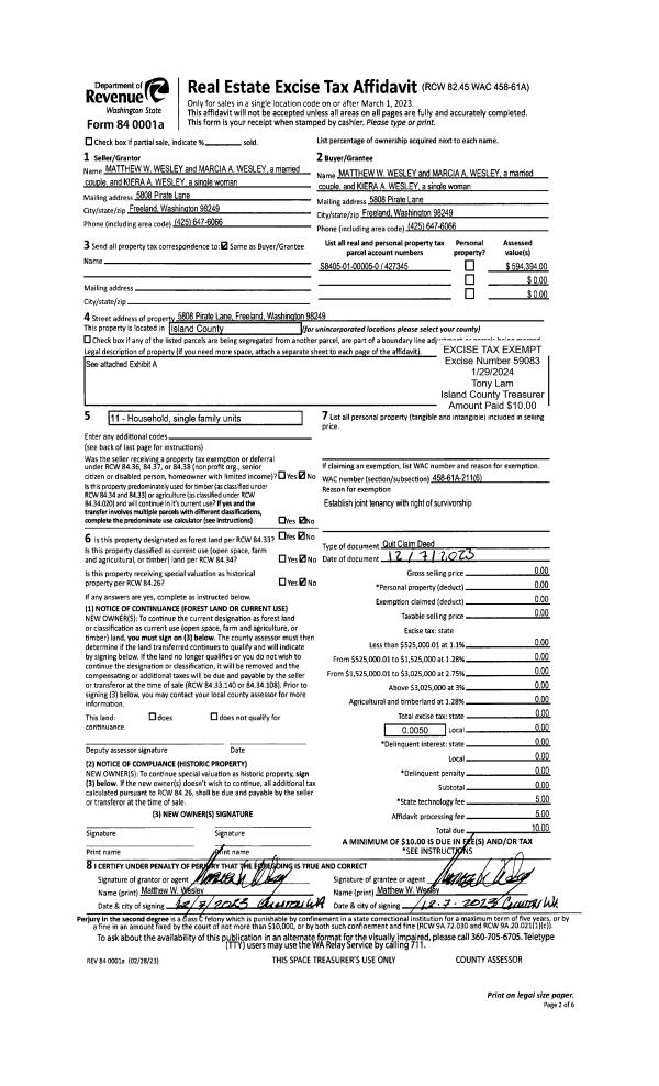 | 1 | 12/07/2023 | QCD | Quit Claim Deed | WESLEY, MATTHEW W | WESLEY JTWROS, MATTHEW W | | | $10.00 | 59083 | 4568942 |