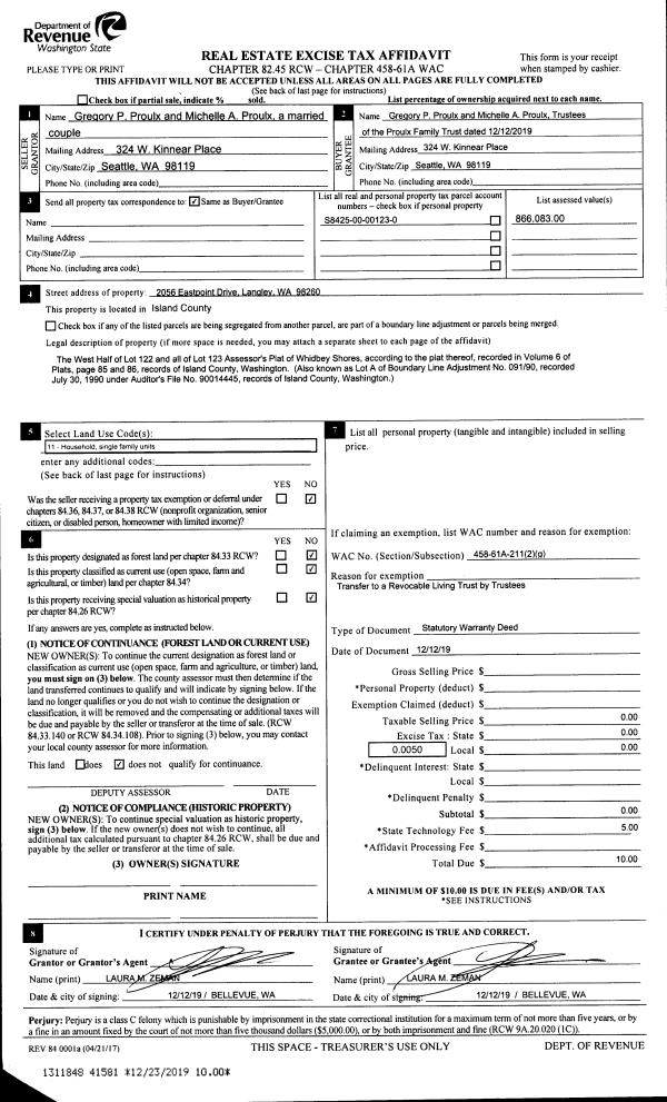 | 1 | 12/12/2019 | WD | Warranty Deed | PROULX, GREGORY P | PROULX TTEE, GREGORY P | | | $0.00 | 41581 | 4478055 |