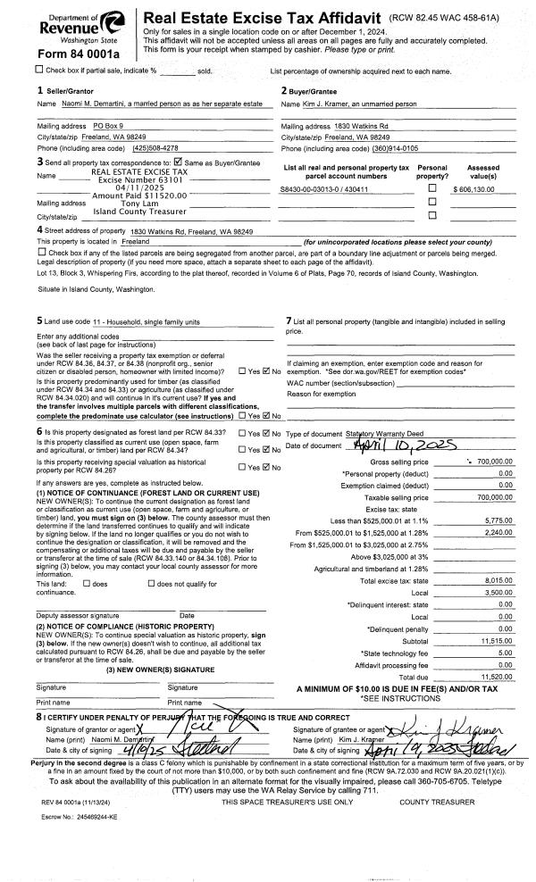 | Mailing Address: | 1830 WATKINS RD FREELAND, WA 98249 | % Ownership: | 100.0000000000% |