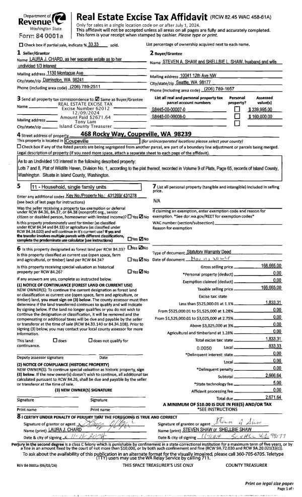 | 1 | 11/11/2024 | WD | Warranty Deed | CHARD, LAURA J | SHAW, STEVEN A | | | $166,665.00 | 62012 | 4580167 |