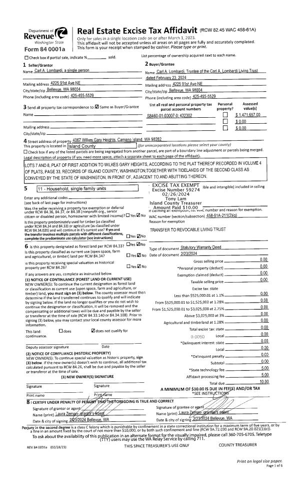 | 1 | 02/23/2024 | WD | Warranty Deed | LOMBARDI, CARL A | LOMBARDI TTEE, CARL A | | | $0.00 | 59274 | 4569711 |