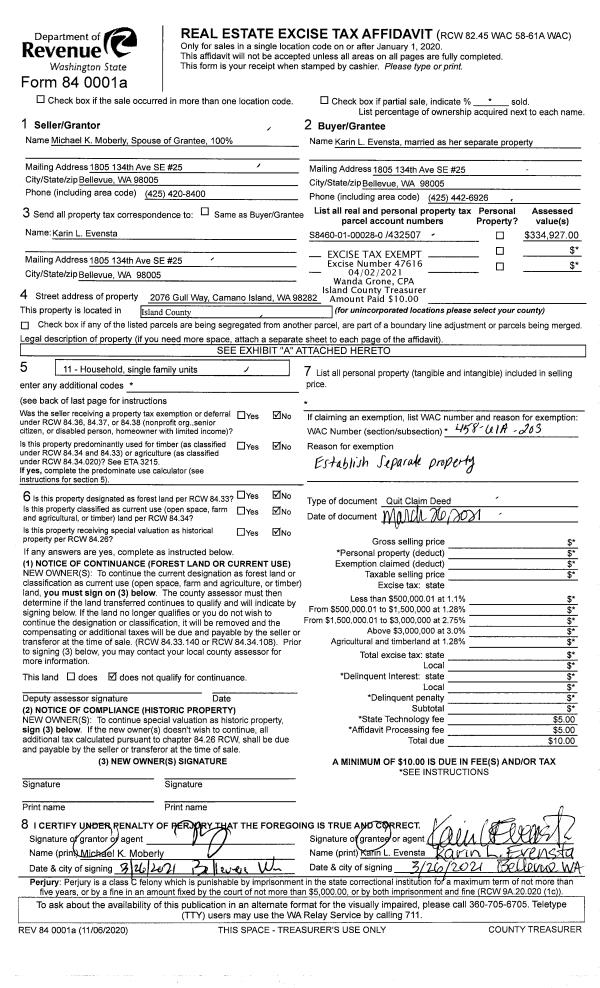 | 1 | 03/26/2021 | QCD | Quit Claim Deed | MOBARLY, MICHAEL | EVENSTA, KARIN L | | | $0.00 | 47616 | 4515374 |