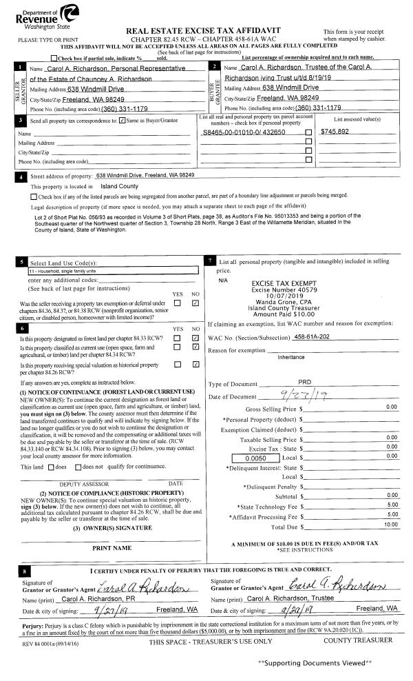 | 2 | 09/27/2019 | WD | Warranty Deed | RICHARDSON, CHAUNCEY A | RICHARDSON TTEE, CAROL A | | | $0.00 | 40579 | 4472833 |