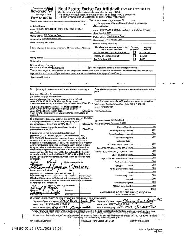| 1 | 12/08/2020 | PRD | Personal Representatives Deed | ENGLE BROWN, JOANNE | ENGLE TTEE ET AL, CHERYL JUNE | | | $0.00 | 50113 | 4529615 |