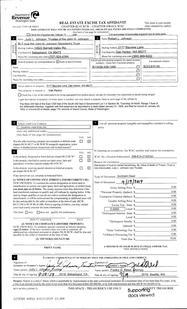 | 1 | 09/19/2019 | QCD | Quit Claim Deed | JOHNSON TRUSTEE, JUDY L | JOHNSON, ROBERT L | | | $0.00 | 40516 | 4472530 |