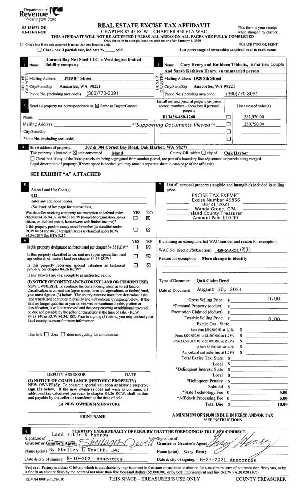 | 2 | 08/30/2021 | QCD | Quit Claim Deed | CORNETT BAY NET SHED, LLC | HENRY, GARY O | | | $0.00 | 49856 | 4528111 |