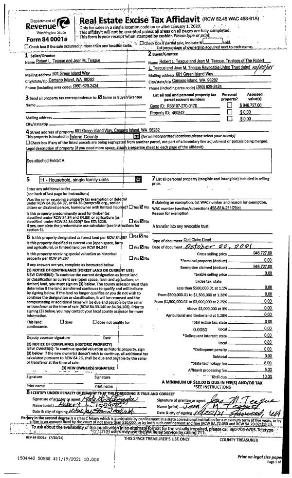 | Mailing Address: | JEAN M TEAGUE TTEE 601 GREEN ISLAND WAY CAMANO ISLAND, WA 98282 | % Ownership: | 100.0000000000% |