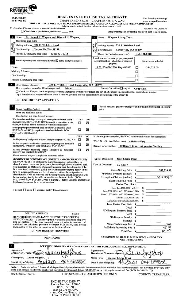 | 2 | 03/24/2017 | QCD | Quit Claim Deed | WAGNER, FERDINAND R | WAGNER TRUSTEE, FERDINAND R | | | $0.00 | 42640 | 4484721 |