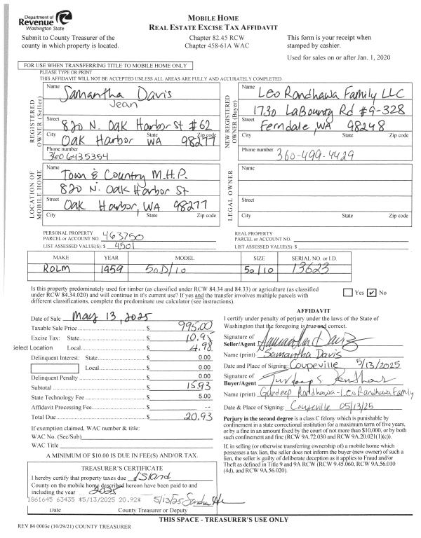 | 1 | 05/13/2025 | MANHOME | Manufactured Home | DAVIS, SAMANTHA | LEO RANDHAWA FAMILY, LLC | | | $995.00 | 63435 | |