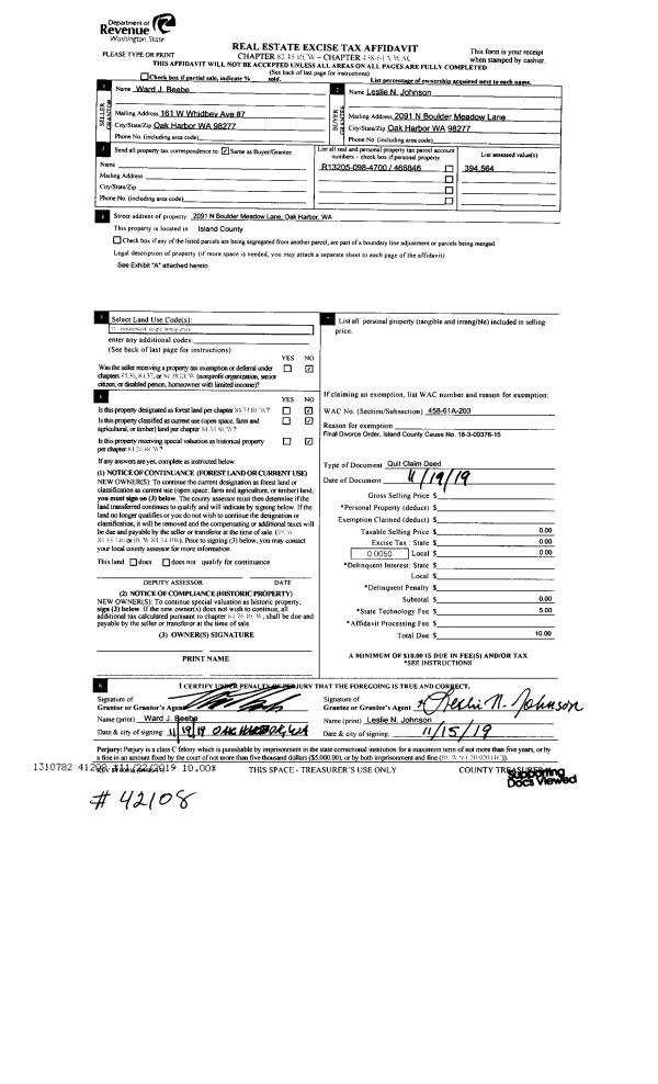 | 1 | 11/19/2019 | QCD | Quit Claim Deed | BEEBE, WARD J | JOHNSON, LESLIE N | | | $0.00 | 41208 | 4476104 |