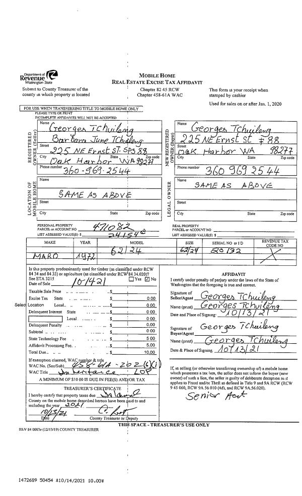 | 2 | 10/14/2021 | MANHOME | Manufactured Home | TCHUILENG, BARBARA | TCHUILENG, GEORGES | | | $0.00 | 50454 | |