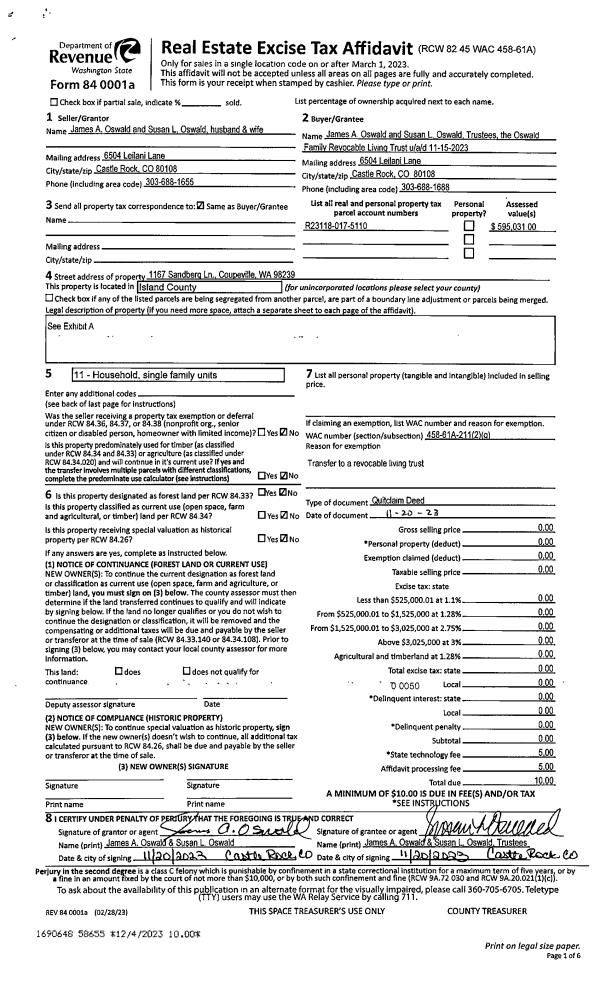 | 1 | 11/20/2023 | QCD | Quit Claim Deed | OSWALD, JAMES A | OSWALD TTEE, JAMES A | | | $0.00 | 58655 | 4567229 |
