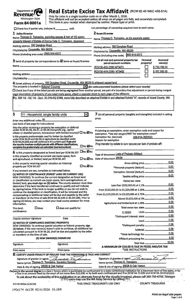 | Mailing Address: | DONNA KATE O TOMASINO 185 DONAHEY RD COUPEVILLE, WA 98239 | % Ownership: | 100.0000000000% |