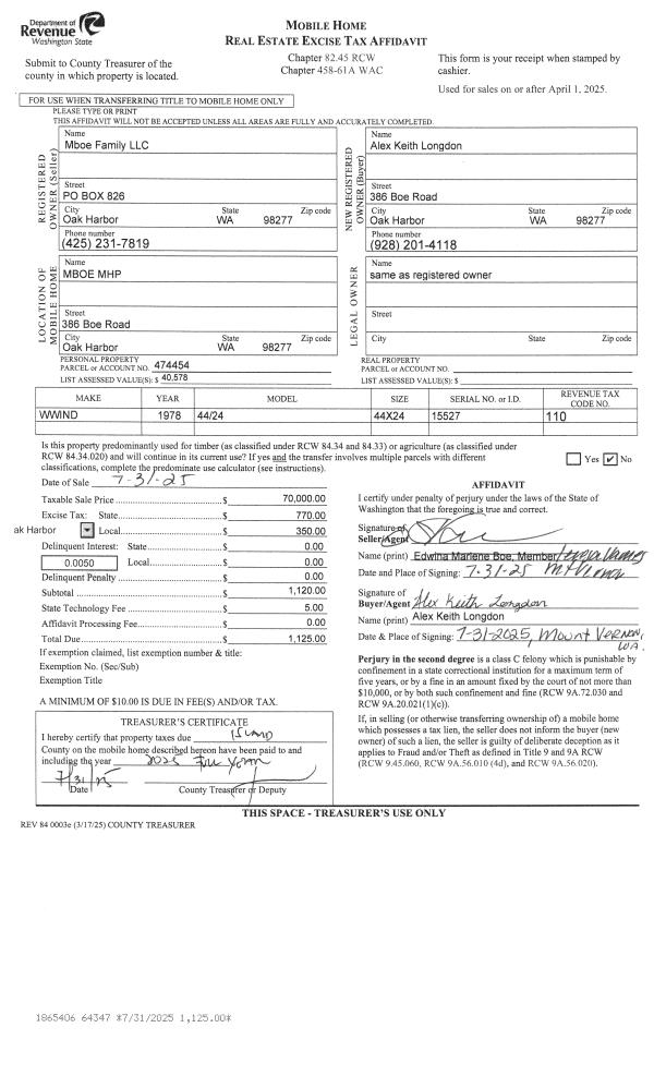 | 1 | 07/31/2025 | MANHOME | Manufactured Home | MBOE FAMILY LLC | LONGDON, ALEX KEITH | | | $70,000.00 | 64347 | |